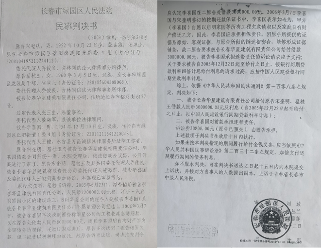 2009年11月12日,在事实清楚的情况下,长春市绿园区人民法院依然作出(2009)绿民一初字第348号违背事实的判决:被告华星公司给付原告宋奎明、翟桂玉借款人民币三百万元及利息,被告李喜国对前款承担连带责任。