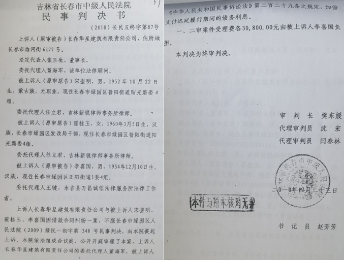 华星公司接到判决书第一时间提起上诉,长春市中级人民法院受理后开庭,就双方争议问题做了认真调查,并于2010年4月23日作出(2010)长民五终字第87号《民事判决书》,判决称:2005年6月23日李喜国与宋奎明签订了220万元的借款协议并给宋、翟出具了借条,2006年3月7日李喜国在宋、翟处借款80万并出具了借条,2006年3月7日李与宋签订了300万的按期还款保证书,上述借款协议、借条及按期还款保证书中,李均是以个人名义与宋、翟签订的,系李个人借款,上诉人华星公司均未签字盖章认可,上诉人2005年6月22日盖章的委托承诺协议书发生在李借款之前,且该委托协议书仅是上诉人对工程回款支取的承诺,并非对之后发生的李借款还款的承诺,因此李喜国个人借款与华星公司无关,借款应由李个人偿还。