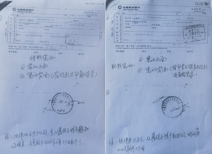 大约两年之久,翟与宋“找”出4份“新证据”向吉林省高检提出抗诉申请,这4份“新证据”是银行的“储蓄取款凭条”,凭条取款日期分别为:2005年6月23日“54万”、2005年6月23日“11万”、2005年6月27日“15万”、2005年7月6日“30万”。