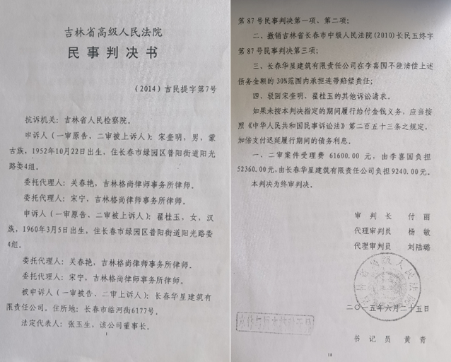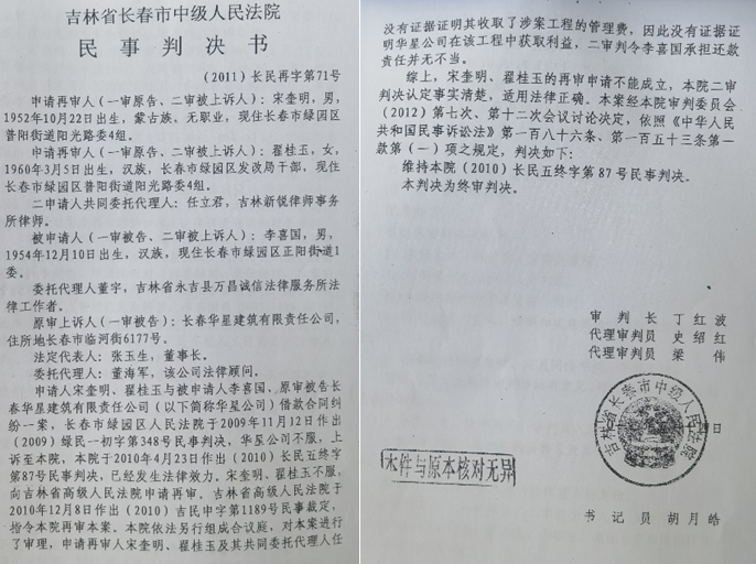 据华星公司张总称,宋奎明与翟桂玉根本不同意向李喜国主张权利,接到判决书后,二人没有走正常程序向吉林省高院提起再审,而是由当时升为某局副局长的翟桂玉利用自身人脉找到了省内某位政法领导,后在该领导干预下,这起案件在长春中院启动再审,再审法官顶住层层压力,最终作出(2011)长民再字第71号《民事判决书》,维持了(2010)长民五终字第87号判决。