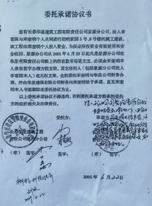 2005年6月22日,也就是李喜国拿到宋奎明第一笔借款的前一天,宋奎明为了投资回收有保障,他与华星公司及身为华星公司星源分公司负责人的李喜国签订了一份《委托承诺协议书》。