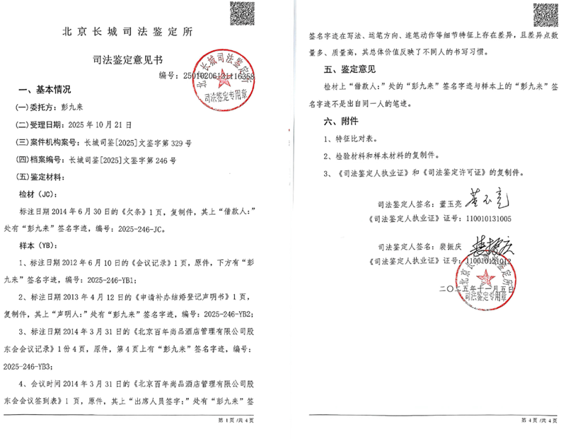2025年11月,第二次北京司法鉴定机构的鉴定结果还是显示所谓“彭九来”签名的借条和样本上的签名“两者不是出自同一人笔迹”