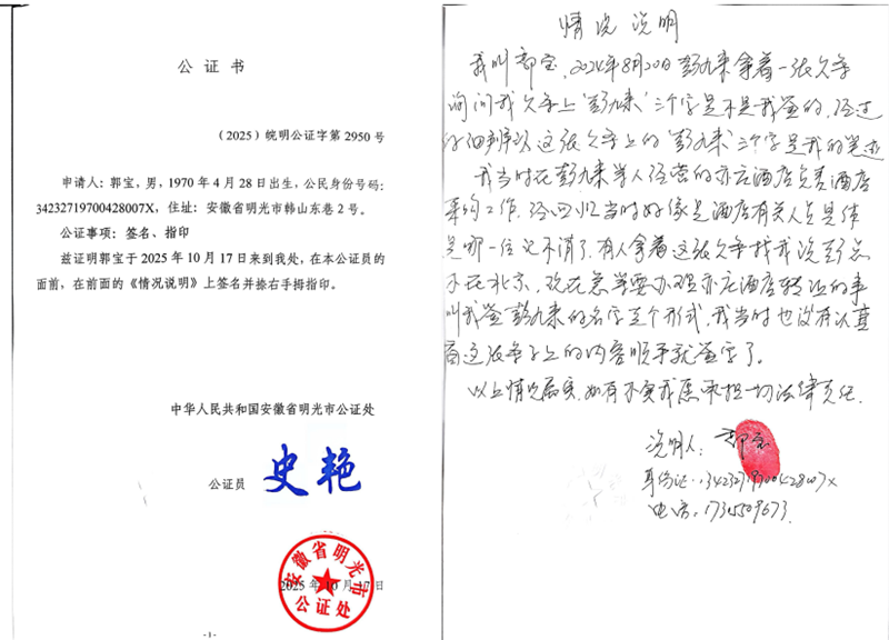 彭九来表示自己只是公司股东之一,资金也并不是个人所用,不同意出具欠条。彭九来说:“我只是持股15.63% 的小股东,不可能由我个人去承担全部公司的债务。我拒绝后,在我离开公司回明光的这一期间,张某珍单方面安排人员,以出售酒店的名义找百年食府公司原法定代表人、郭宝伪造我的签名签署“彭九来”名字,并找天玺酒店公司其他两名股东樊某林、徐某海在日期为2014年6 月 30日的欠条上签字。我从未出具过欠条,更从未同意或认可由我个人来承担公司的770万元借款债务,况且,另外的1000万元属于出资款,也无法作为借款偿还”。彭九来还几经周折找到了当时在欠条上签其名字的人员郭宝并针对欠条上系郭宝签名而非彭九来签名进行了公证。同时,为了证明自已的清白,彭九来还分别在安徽、北京二家司法鉴定机构针对“欠条中署名彭九来是否为其本人书写”进行了司法鉴定,二家司法鉴定机构的鉴定结果均认定欠条上“彭九来”签名非彭九来本人所签。