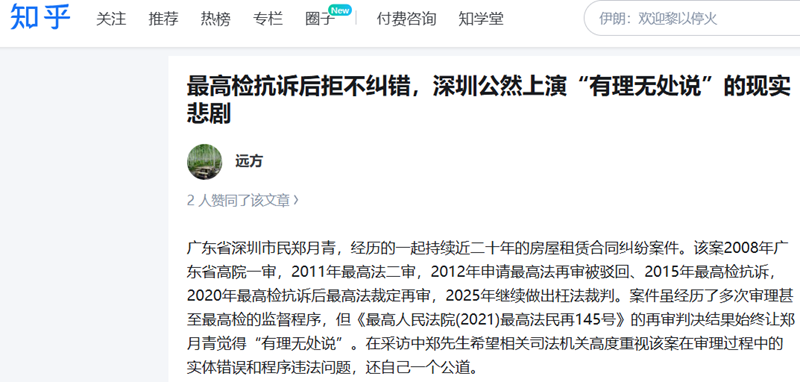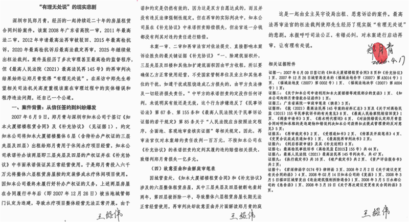 广东省深圳市民郑月青,经历的一起持续近二十年的房屋租赁合同纠纷案件。该案2008年广东省高院一审,2011年最高法二审,2012年申请最高法再审被驳回、2015年最高检抗诉,2020年最高检抗诉后最高法裁定再审,2025年继续做出枉法裁判。案件虽经历了多次审理甚至最高检的监督程序,但《最高人民法院(2021)最高法民再145号》的再审判决结果始终让郑月青觉得“有理无处说”。在采访中郑先生希望相关司法机关高度重视该案在审理过程中的实体错误和程序违法问题,还自己一个公道。