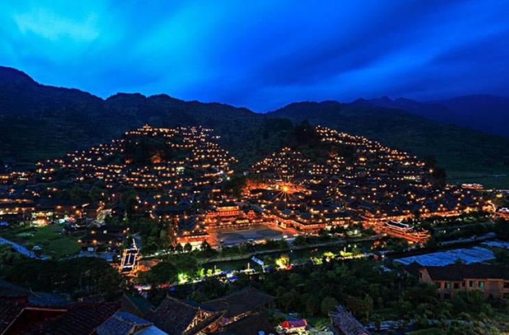 【贵州西江千户苗寨】位于贵州省雷山县东北部,是南山风景名胜区的一部分,目前中国乃至全世界最大的苗族聚居村寨。西江千户苗寨所在地形为典型河流谷地,清澈见底的白水河穿寨而过,苗寨的主体在河流东北侧的河谷坡地上。千百年来,西江苗族同胞在这里日出而耕,日落而息,在苗寨上游地区开辟出大片的梯田,形成了农耕文化与田园风光。