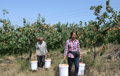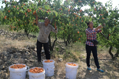 贫困群众张立芳拿着袋子正在杏树下卸果,边摘边告诉笔者:“我就在山下村庄住,一天能挣60块钱还管饭,在家门口很方便,有党的好政策,俺也得好好干,明年俺也要种植果树,好早点致富奔小康。”