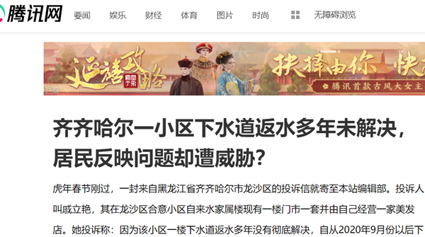 虎年春节刚过,一封来自黑龙江省齐齐哈尔市龙沙区的投诉信就寄至本站编辑部。投诉人叫戚立艳,其在龙沙区合意小区自来水家属楼现有一楼门市一套并由自己经营一家美发店。她投诉称:因为该小区一楼下水道返水多年没有彻底解决,自从2020年9月份以后下水道返水问题愈发严重导致本店彻底关门停业,物业公司虽然进行过维修,但仍未能解决根本问题。据她反映和其提供的证据,在自来水家属楼和戚立艳有着相同遭遇的还有多人,希望有关部门早日彻底解决好下水道返水问题,使居民能早日正常生活或营业。
