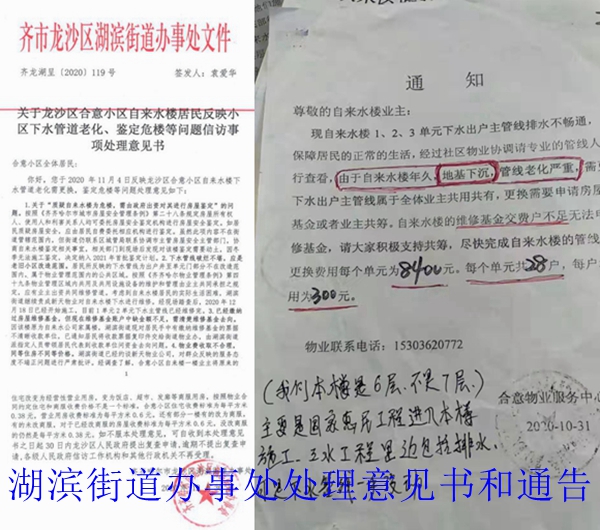 记者从当地居民手中得到的一份文件中看到,湖滨街道办事处称:目前1单元2单元下水主管线已经维修完,需清楚维修基金去向。这份文件是由齐市龙沙区湖滨街道办事处出具的,文件号是齐龙湖呈[2020]119号,文件名是《关于龙沙区合意小区自来水楼居民反映小区下水管道老化、鉴定危楼等问题信访事项处理意见书》(以下简称《意见书》),落款时间是2020年12月30日。《意见书》称:“2、下水管线破烂不堪,应是老旧小区改造范围。居民所反映的下水管线为出户井至单元门部分不在改造范围内,属于物业管理范围内的公共区域。按照《齐齐哈尔物业管理条例》第四十九条物业管理区域内共用及共用设施设备的维护和管理由业主共同承担之规定,应由业主出资共同维修管道。考虑到自来水楼居民的实际生活困难,湖滨街道继续责成新天物业对自来水楼下水进行维修。经现场踏查后,2020年12月18日已经开始施工,目前1单元2单元下水主管线已经维修完。3、已经缴纳过房屋维修基金,但现在维修基金账户中缺金额不足,需清楚维修基金去向。”