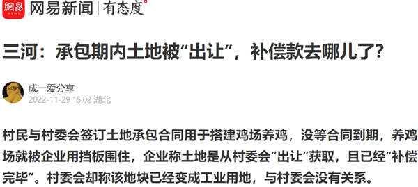 近日,家住河北省三河市泃阳镇北陈庄村民刘艳承包的养鸡场,被当地的企业三河同飞制冷股份有限公司(简称“同飞制冷”)于深夜组织工人用铁皮围挡圈起来准备施工,刘艳找到作为施工方的同飞制冷要求给出解释。接待刘艳的负责人称,刘艳所说的承包地是该企业通过出让的方式获取的,出让金已经交付,过程合理合法,且已经补偿完毕。