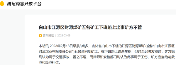 本站讯 2023年2月18日早晨8点多,吉林省白山市下辖的江源区财源煤矿(全称“白山市江源区财源煤业有限责任公司”)五名合同制矿工,在下班路上遭遇车祸,但时至记者发稿时,矿方始终认为属于交通事故,置之不理,而律师和安检部门均认为此事属于工伤,矿方应当给与救济和经济补偿。