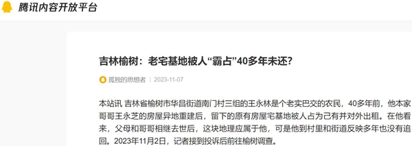 本站讯 吉林省榆树市华昌街道南门村三组的王永林是个老实巴交的农民,40多年前,他本家哥哥王永芝的房屋异地重建后,留下的原有房屋宅基地被人占为己有并对外出租。在他看来,父母和哥哥相继去世后,这块地理应属于他,可是他到村里和街道反映多年也没有追回。2023年11月2日,记者接到投诉后前往榆树调查。
