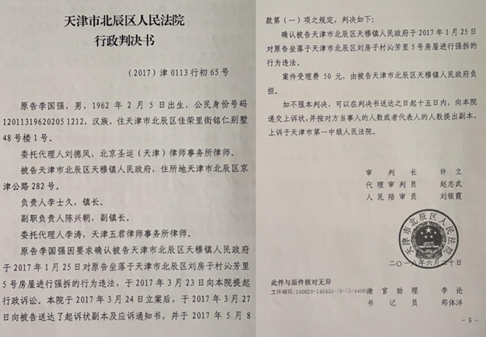 上述暴力强拆事件发生后,为维护自身合法权益,李国强于 2017年3月23 日以北辰区天穆镇政府为被告,向北辰区法院提起行政诉讼,请求法院确认上述强拆行为违法。2018年6月20日,北辰区法院作出(2017)津0113行初65号《行政判决书》,确认天津市北辰区天穆镇政府于2017年1月25日对李国强坐落于天津市北辰区刘房子村沁芳里5号房屋进行强拆的行为违法。李国强为保障自身合法权益,就违法强拆问题对天穆镇政府提起行政赔偿诉讼。然而,对于法院的判决,李国强认为存在不公,存在严重的地方保护问题。