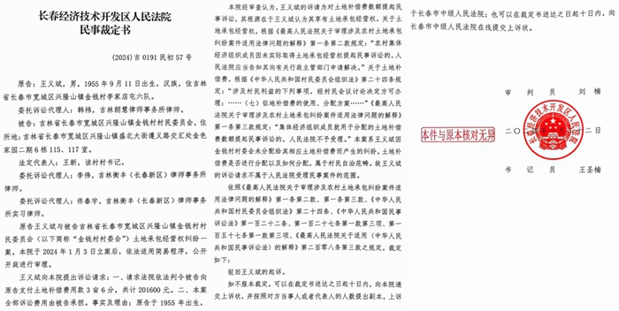 为了维护自己的合法权益,王义斌曾选择通过法律途径维权,但是长春经济技术开发区法院做出的(2024)吉0191民初57号民事裁定书驳回了他的诉讼请求。该裁定书记载:在法庭上,金钱村村委会辩称:一、原告的诉讼请求没有法律及事实依据;原告是金钱村六社村民,1983年生产队包干到户,当时的政策是不参加生产劳动的人员不分地和口粮,要取得口粮和土地需要交一份口粮积累(公益金)和一份土地积累,原告当时只交了一份口粮积累,每人获得520斤粮,放弃了土地积累,所以原告在第一轮土地承包时没有分得土地。而1998年二轮土地承包根据国家政策采取的是“延包”,并不是打乱重分。金钱村经民主决议所作出的“菜地不予调整”,顺应国家政策的导向,原告所在地菜田地和大田地没有打乱重分,原告没有分得菜田地和大田地。金钱村六社土地征收补偿款的支付依据是在本村签署土地承包合同并享有土地,按照土地承包合同支付补偿款。原告没有实际取得案涉土地也没有案涉土地承包合同,因此不具备分配案涉土地征收补偿款的资格。