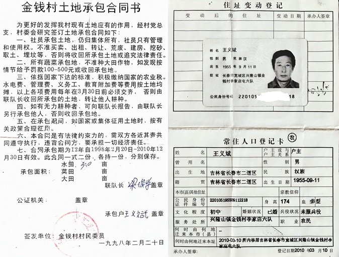 王义斌家住长春市宽城区兴隆山镇金钱村李家店屯六队,他向媒体介绍:他是71年在122中上的初中,因家中生活困难提前辍学,72年到金钱村六队干活,一直到1979年生产队成立铁匠炉时,六队把他和李如刚、李学军调到铁匠炉打铁。1980年的一天,李如刚家中有事请一天假,因打铁少一人,队长张志忠就把徐现有派来顶替,但因徐现有打铁不熟练,把大锤打偏,当时就把王义斌的眼睛崩坏了,医院医生诊断为左眼眶断裂性骨折眼球突出,眼眶眼底充血,眼仁扩散,必须住院治疗。在医院住了20多天见有好转后,他就出院回家自养,因为他有伤不能干活,生产队开会决定每年给他补助600工分。当时六队的工分不值钱,1分工才核8分钱,600工分只核48元,连一口人的口粮都不够。因此,他找到六队,队长张志忠召集班子开会研究,决定对他给与特殊照顾:王义斌可以自己到外边找活干挣钱补充家用,其出外打工(是指到市里找零活干),生产队算王义斌是队里派出务工人员,口粮交钱照发。当时农村生产队的社员是不准个人到市里找活干的,如果自己找活干,不参加队里干活是不发口粮的,生产队让他自己找活干还给发口粮,按生产队派工出,王义斌感激万分,他万万没有想到却因此在1983年第一次土地承包到户时没有分到土地,也就没有土地承包合同。他的父亲王化远也在1983年第一次分地时没有分到土地。