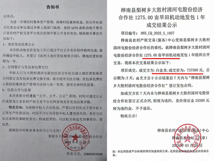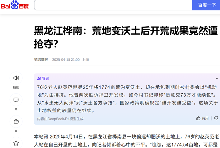 本站讯 2025年4月15日,多家网络媒体曾经以《黑龙江桦南:荒地变沃土后开荒成果竟然遭抢夺?》为题报道了黑龙江省...