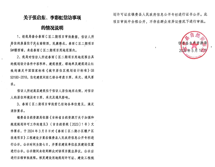 面对争议,镇赉县相关部门作出了回应。镇赉县自然资源局于 2025年5月12日发布情况说明,称信访人所居住房屋不在春雨 C 区二期项目用地范围内,项目的容积率、建筑密度等规划设计条件满足国家标准,住宅建筑间距已综合考虑日照、采光、通风要求,不存在对信访人居住环境的影响,且项目审批前已征询各单位意见、进行公示,公示期间未收到群众异议,后续审批流程规范,全程公开,不存在群众有异议情况下进行审批的情况 。