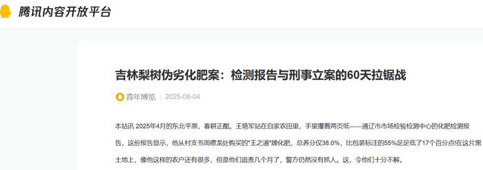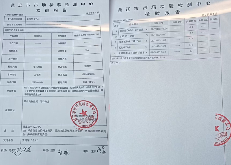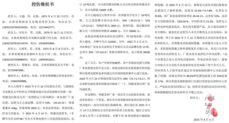 本站讯 2025年4月的东北平原,春耕正酣。王艳军站在自家农田里,手里攥着两页纸——通辽市市场检验检测中心的化肥检测报告,这份报告显示,他从村支书周德龙处购买的"王之道"牌化肥,总养分仅38.0%,比包装标注的55%足足低了17个百分点!在这片黑土地上,像他这样的农户还有很多,但是他们追责几个月了,警方仍然没有抓人。这,令他们十分不解。