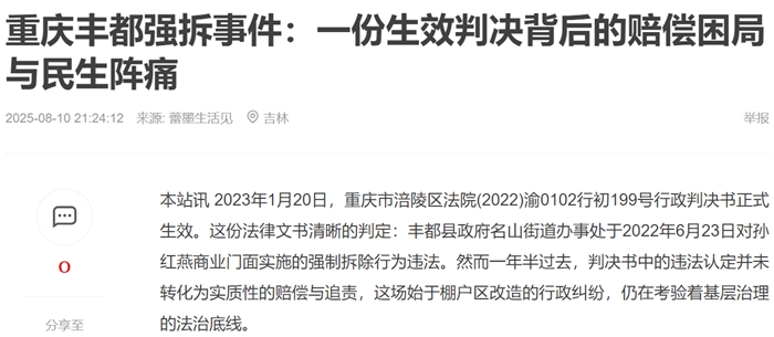 本站讯 2023年1月20日,重庆市涪陵区法院(2022)渝0102行初199号行政判决书正式生效。这份法律文书清晰的判定:丰都县政府名山街道办事处于2022年6月23日对孙红燕商业门面实施的强制拆除行为违法。然而一年半过去,判决书中的违法认定并未转化为实质性的赔偿与追责,这场始于棚户区改造的行政纠纷,仍在考验着基层治理的法治底线。