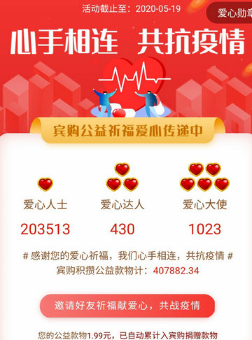 面对这突如其来的疫情,汇能科技领导及时召开会议,在做好本公司防疫的同时,积极动员全体员工,充分利用互联网科技和宾购商城平台优势,于2月20日发起了“你献爱心,我出钱,大爱宾购抗疫行”的爱心传递活动。活动一经推出,便得到了社会各界人士的高度认可和积极响应,一周内送祈福献爱心的仁人志士就超过了二十万人。