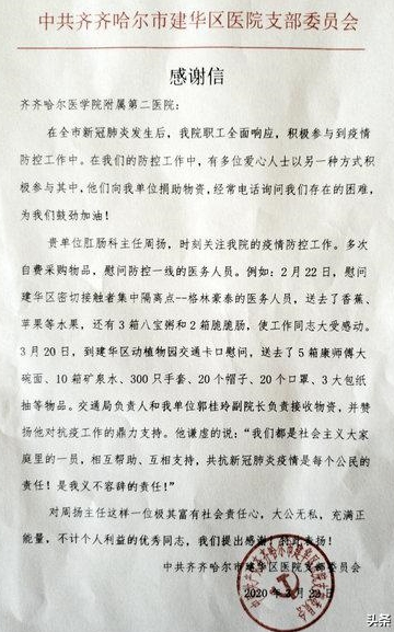 疫情无情人有情,慷慨捐赠战疫情。近日,黑龙江省齐齐哈尔医学院附属二院再次接到中共齐齐哈尔市建华区医院支部委员会致肛肠外科主任周扬的表扬信,信中字里行间表达了对周扬主任的感激之情。