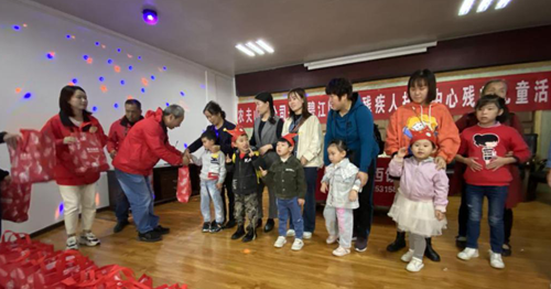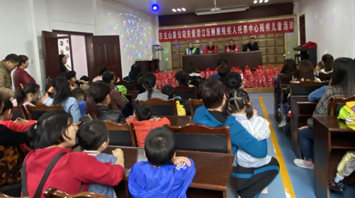 图为:刘伟总经理为残疾儿童发放慰问品活动一角。
