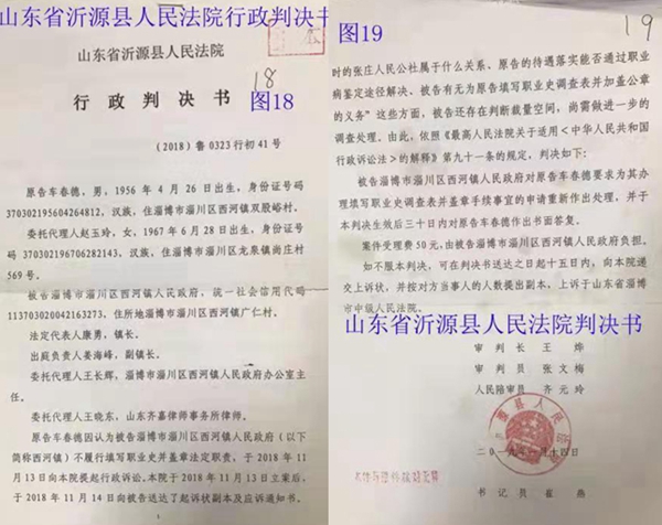 后来,律师又告诉他:“看来只能打行政官司了,建议你去法院起诉西河镇政府吧?”车春德无奈,将西河镇政府告到了沂源县人民法院因行政诉讼原告可以避开本区县法院),诉求西河镇政府在《职业病职业史调查表》中加盖公章。 最后,沂源县人民法院下达了(2018)鲁0323行初41号判决书,判决:“被告淄博市淄川区西河镇人民政府,为车春德办理职业史调查表,并就盖章手续事宜的申请重新作出处理,并于本判决生效后三十日内,对原告车春德作出书面答复。"法院判决书生效后,西河镇人民政府出示了《处理意见书》,称:“车春德,关于你反映的西河镇人民政府不履行填写职业病史并盖章法定职责,依据(2018)鲁0323行初41号,经调查,你未在我单位工作,未签订劳动合同,未建立劳动关系,我单位没有为你盖章的义务。”