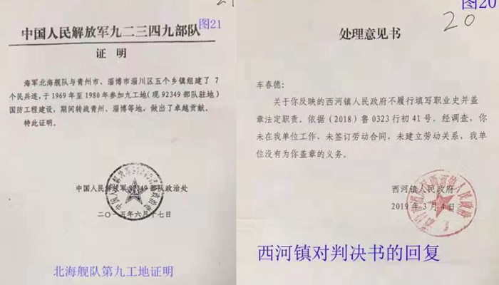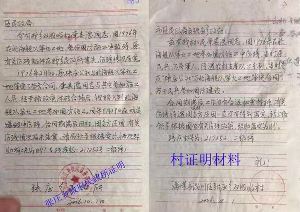 记者从张庄乡民政所开具的证明信中看到,1976年初原张庄人民公社与北海舰队第九工地签订了劳务合同,车春德与120余名基干民兵经过严格政审和体检,经由公社干部陈先富带队,到北海舰队第九工地4812工程参加了国防建设施工。现中国人民解放军92349部队也出具了证明信。西河镇双股峪村也证明车春德有用工合同,伤残费用及补助也没有得到落实。西河镇党委也曾答应车春德给予解决赔偿其伤残费用。可是至今,这些证明和承诺都随风而去,没了音讯。