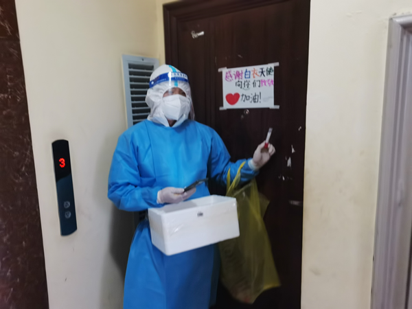 本站讯“上门做核酸,入户送温暖。抗疫一线大白辛苦了!”4月5日,驰援长春市的西安市医疗队在绿园区西环城路万盛社区入户做核酸检测的时候,看见居民在门上书写的一段文字,西安市医疗队张茹芳(女)感动地说:“这是我们应该做的。”