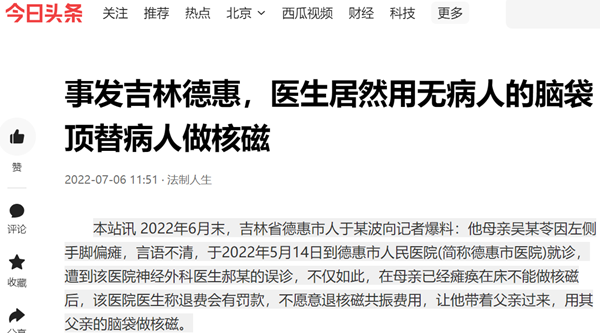 本站讯 2022年6月末,吉林省德惠市人于某波向记者爆料:他母亲吴某苓因左侧手脚偏瘫,言语不清,于2022年5月14日到德惠市人民医院(简称德惠市医院)就诊,遭到该医院神经外科医生郝某的误诊,不仅如此,在母亲已经瘫痪在床不能做核磁后,该医院医生称退费会有罚款,不愿意退核磁共振费用,让他带着父亲过来,用其父亲的脑袋做核磁。
