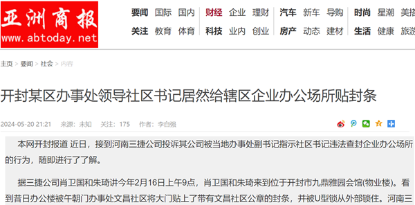 本网开封报道 近日,接到河南三捷公司投诉其公司被当地办事处副书记指示社区书记违法查封企业办公场所的行为,随即进行了了解。