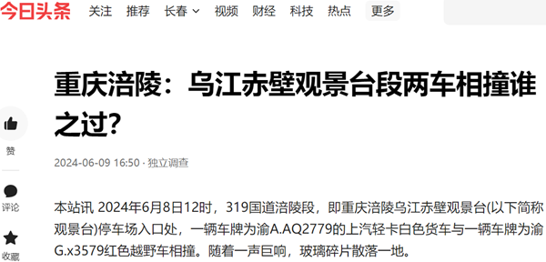 本站讯 2024年6月8日12时,319国道涪陵段,即重庆涪陵乌江赤壁观景台(以下简称观景台)停车场入口处,一辆车牌为渝A.AQ2779的上汽轻卡白色货车与一辆车牌为渝G.x3579红色越野车相撞。随着一声巨响,玻璃碎片散落一地。