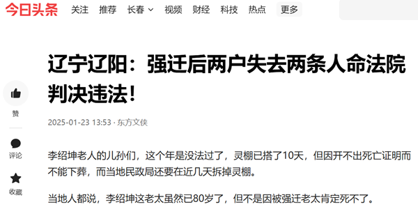 按当地的习俗,人老了第三天就要下葬的,可李绍坤却无法下葬,原因是,她的儿女要求政府出个死因是强迁导致的这样一个死亡证明,当地政府当然不会承认这样的结果,于是,东北的三九天,全家人只能昼夜守着灵棚。但是,此举还被当地政府部门认定为“给政府施压”,并还要对灵棚进行强迁。