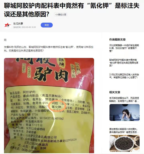本站讯 前几天,有网友向百度新闻爆料称买到了含有剧毒化学药物氰化钾的的东阿阿胶驴肉,山东省东阿县市场监管局却一直纵容生产企业,至今产品依然在火爆销售。