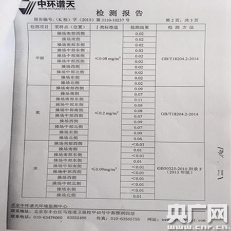 对于校方提供的检测合格的报告公示,多位家长表示不认可。比如,有报告前一天取样送检,第二天就有了结果。记者注意到,这份报告是对操场多点位甲醛、氨、苯等空气质量项目的检测,检测依据是室内环境污染控制规范。