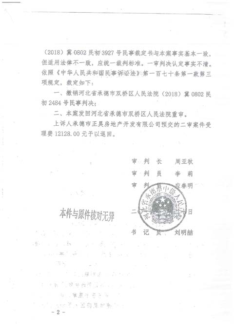 至此,我已是钱房两失。有趣的是,中级人民法院作为依据撤销我胜诉判决的双桥区人民法院(2018)冀0802民初3927号民事裁定在二审时同样被撤销了。一切绕了一个圈,最后又回到了原点。