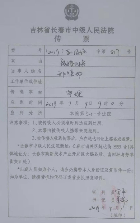 该离婚上诉案卷宗于2019年2月被送至长春中级法院,同时被分到民事二庭主审法官宫平手上。宫平法官只是阅卷就耗时3个月,于2019年5月7日才确定公告送达(附公告费收据扫描件),开庭时间为2019年7月9日上午9:00点,地点在长春市中级人民法院第31号法庭(附传票扫描件)。原告心想总算有盼头儿了,可马上就要到期了,发生的怪事更让人匪夷所思。2019年7月8日距离开庭审理的前一天,主审法官居然通知原告取消庭审。当原告问她为啥时,主审法官宫平却给不出任何正当合理的理由,胡乱编造一些糊弄小孩的说法来应付。于是原告便找到了民二庭陶庭长,说明了情况并把要求开庭的材料交上。过几天再联系陶庭长,他说已把材料转交给郭副庭长了,后听说陶庭长要辞职,所以就再没找他,可郭副庭长一直就联系不上,监察室也联系不上。原告没办法只能找信访办,可信访办的人说判决未出来,属于程序之中的事不归他们管。从网上看到长春市领导接待信访日程表中有中院院长程凤义的接待日,原告就试图面见程凤义,可通过中级法院信访处、长春市信访局以及长春市外办等单位都未能成行。原告无奈只能通过快递与挂号信件,来反映主审法官宫平的错误并要求尽快开庭审理。有幸的是,8月份在与长春中院信访处陈明哲处长接触中,陈处长告诉原告:程凤义院长已经收到原告的来信,并表示会关注此事。可时间快过一年了还是没消息,现在仔细回想长春中级法院出现在该离婚案上的一些“怪事”都是阴谋。原告经了解方知内部端详,原来朝阳区法院刘春梅院长,以前就是长春中院民二庭庭长,被告齐丽华有个校友就是朝阳区法院副院长,与宫平法官及中院的相关领导都很熟,这就难怪了,所有发生在长春中级法院的这些“怪事”都是精心设计的。例如: