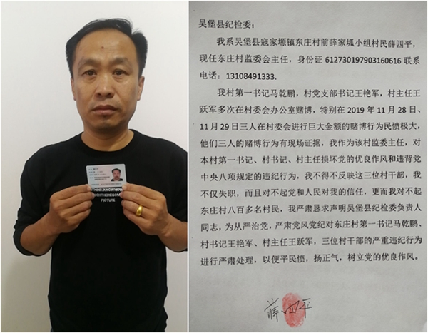 举报人身为群众选举出来的并得到村民信任的监委会主任,就应向东庄村民负责,更应向国家和党负责,有权监督被举报人的违法、违纪、犯罪行为。因举报人于2019年1月20日向吴堡县纪委、吴堡县公安局实名举报三被举报人,并向纪委、公安局提供三被举人在东庄村委会赌博的视频资料,但时至今日,吴堡县纪委、吴堡县公安局没有给举报人作出任何答复,故无奈之下向市纪委实名举报,同时将举报信发布于网上,恳请市纪委实地调查该案,依法依规查处。被举报人如涉嫌犯罪,请依法将其送司法机关处理。