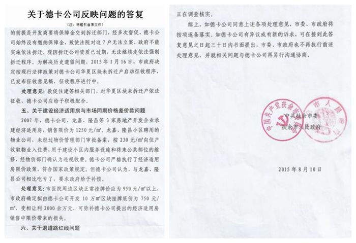 对于2007年扶余市政府列出的华夏棚户区改造项目,德卡公司投入上亿元资金,政府却以经济适用房为由对我公司限价销售,每平米仅售1250元,使我们没有赚到钱反而亏损几千万。该棚户区建筑面积66000平方米,商品房住宅销售面积41200平方米,当时的其他三家棚户区销售价格分别为:龙嘉2728元/平方米、隆昌3380元/平方米、财源2280元/平方米,仅此一项,我公司就损失6000多万元!