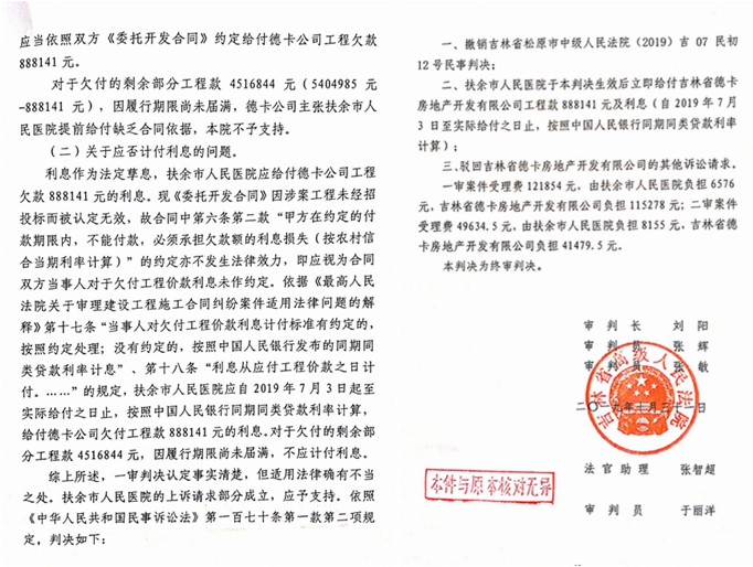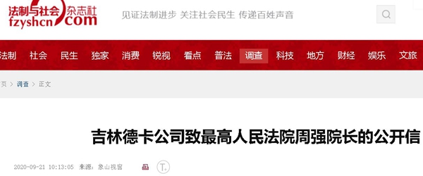我是吉林省德卡房地产开发有限责任公司(简称德卡公司)董事长姜永库。有幸拜读了您在2020年5月25日做的最高人民法院工作报告,感触颇多,现就本企业在吉林省扶余市投资的遭遇,特向您写这封公开信,期望您和中央领导们能够看到。