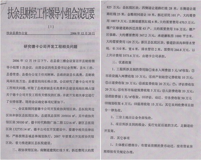 我公司于2006年由扶余五大班子招商引资进入扶余后,当时的扶余县政府给我公司出具了政府财经领导小组《会议纪要》,按照该会议纪要,我公司享受三宗土地出让金全部免收税费即征即退的优惠政策。之后,德卡公司履行承诺,于2008年将22000多平米的县医院建设完成并装修结束交付使用,2010年9月出决算报告,但是政府拖延两年时间才给出决算,金额为3651万元。