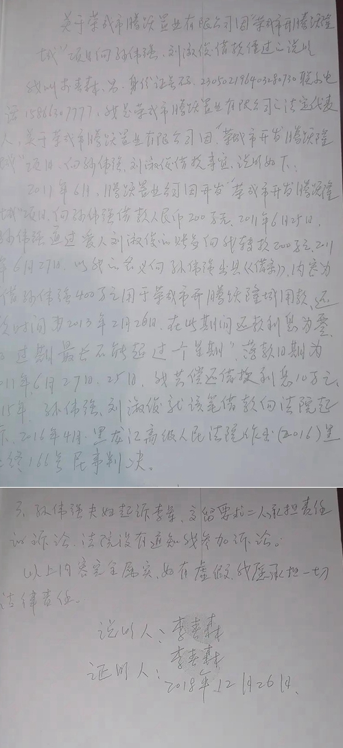 孙伟强身为双鸭山市人民法院科级干部,违规违法发放高利贷,反映人及家人及财产成为了其发家致富的垫脚石,在得到巨额利益的同时,使反映人身陷旋涡。 孙伟强与其妻子刘淑俊,涉嫌伪造债务,用伪造借据上签字的借条提起诉讼,又利用手中职权和关系网,直接左右案件的结果,置国家法律法规于不顾!法院干部放高利贷绝对是对法律的蔑视,是对国家审判权的蔑视,更是对社会期待的公平和正义的蔑视!一个亵渎法律的法院干部比黑恶势力更可怕!这何尝不是司法界的“恶势力”?