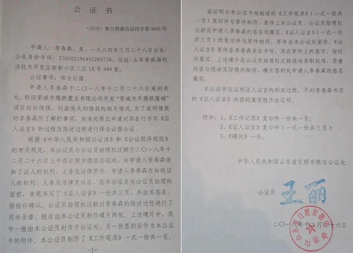 被指伪造李军签名的欠条 这就是那张欠条,据李春森在后附的公证书上明确说明,他在这张欠条上签字的时候,底下担保人和电话那两栏是空白的,至于后来怎么有了李军的担保,他是一概不知。不过他现在才明白过来,当时孙伟强夫妇并未真的想再借给他400万,而是骗他在这510万的欠条上签字。(2018年12月,李春森在山东省日照市德信公证处为二次借款做出声明,并未接到二次借款的金额,二次借款,签字时,担保人和电话两栏均是空白)