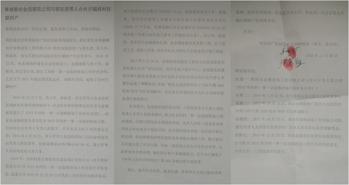 我们是河北省廊坊市广阳区北旺乡西村村民,我们要实名举报廊坊市金囤建筑工程有限公司(简称金囤建筑)与郭东进、英士军、陈淑英、高宝芬相勾结骗取西村巨额财产的犯罪事实。2015 年12月,在未得到村委会认证的情况下,金囤建筑与英士军、陈淑英、高宝芬合谋,签订了西村一事一议道路附加工程补充合同,之后又于2017年通过到法院起诉、调解的手段,骗取了西村巨额财产。