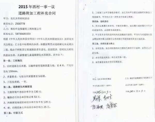 证据一:廊坊市金囤建筑工程有限公司与英士军等人签订的(2015华西村一事一议道路附加工程补充合同》↑