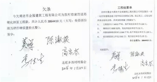 2015年12月3日,英士军、陈淑英、高宝芬等人在未经村民或村民代表同意的情况下,以北旺乡西村村委会的名义与金囤建筑签订了《215年西村一事一议道路附加工程补充合同》,约定由金囤建筑负责北旺乡2015年西村一事一议道路附加工程,但该协议仅有英士军等人的签字,并未加盖北旺乡西村委会公章。2016年1月22日,英士军等人就道路附加工程向金囤建筑出具的工程结算单,结算金额显示为3864410.00元,英士军等人向金囤建筑出具欠条。