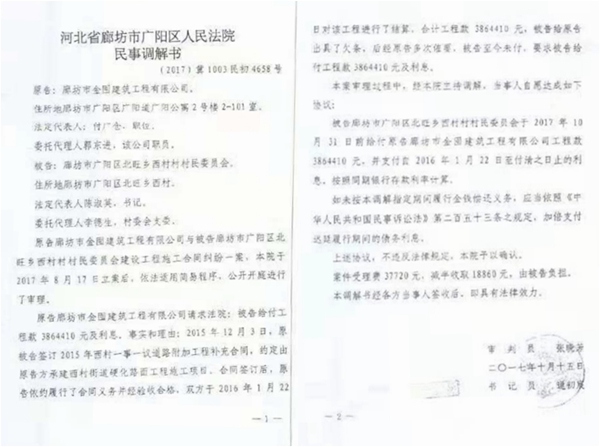 2017年8月16日,金囤建筑以拖欠工程款为由将北旺乡西村村委会诉至广阳区法院。就在本案立案后不久,金囤建筑的委托代理人郭东进很快与当时北旺乡西村村委会的诉讼代理人李德生达成了调解协议,并由广阳区人民法院作出了(2017)冀1003民初4658号民事调解书,并在此后申请法院对北旺乡西村村委会进行强制执行。