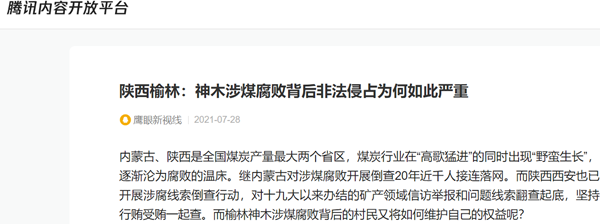 反腐败斗争压倒性遏制煤矿领域腐败蔓延势头,就几个不法分子侵占农民耕地就能随意露天开采吗?难道陕西监管部门形同虚设吗?神木涉煤腐败背后非法侵占为何如此严重?