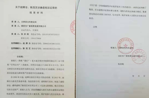 2006年7月、9月,赵卿全分别利用伪造其与广新公司及白河林业局的《股权转让协议》、《股东会决议》及《授权委托书》、伪造白河林业局公章等方式,将广新公司持有的百利公司62.64%股权及白河林业局30%股权转让到其个人名下或受其实际控制,非法侵占我们的财产。而经吉林省公安厅鉴定,《股权转让协议》、《股东会决议》及《授权委托书》、白河林业局公章等均系赵卿全伪造的,赵卿全涉嫌职务侵占罪。