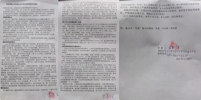 尊敬的中纪委、全国政法队伍教育整顿领导小组领导,欠债还钱天经地义,我一直承认欠秦贞军的钱,也真心感激当时秦贞军帮我救急。当我与秦贞军的矛盾不可调和的时候,他选择了诉诸法律。我与朱广东虽然都是法盲,但我们守着基本的道德底线,秦贞军在法庭上使用造假证据,我不怪他,因为有正义的法律为老百姓护航。然而,令人遗憾的是:正义的法律之剑,却让颠倒黑白的邵明伟把持着,最终做出了严重侵害我和朱广东合法权益的枉法裁判。