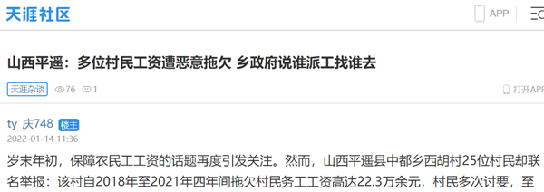 岁末年初,保障农民工工资的话题再度引发关注。然而,山西平遥县中都乡西胡村25位村民却联名举报:该村自2018年至2021年四年间拖欠村民务工工资高达22.3万余元,村民多次讨要,至今无果。